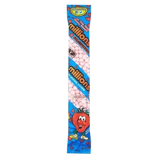 Buy Millions Tube Strawberry Gluten Free 55g for a pocket-sized burst of chewy, strawberry-flavoured candy beads. These gluten-free tres are perfect for on-the-go snacking — the Best Snacks Shop in Canada for gluten-free options.