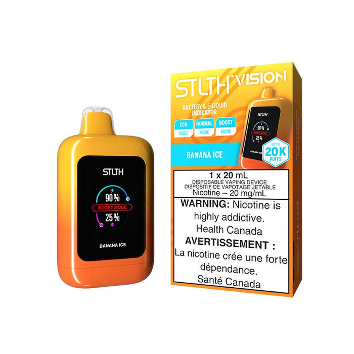 Buy STLTH Vision 20K Banana Ice and indulge in the creamy sweetness of banana with a refreshing icy kick. Smooth, sweet, and cooling all in one puff. Designed for long-lasting use with up to 20,000 puffs. Stylish and convenient for vaping anytime, anywhere. Grab it now , the Best Vape shop in Canada.
